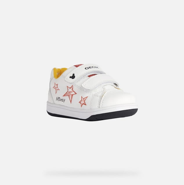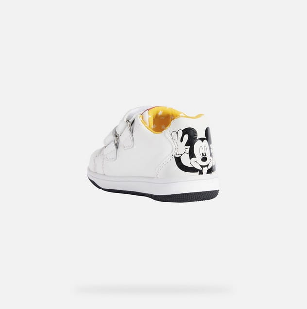 Model NEW FLICK to komfortowe, lekkie i elastyczne półbuty dla najmłodszych od marki GEOX. Kolor biały z postacią myszki Mickey. Cholewka wykonana została ze skóry naturalnej licowej. Wyjmowana wkładka wykonana ze skóry naturalnej, podszyta została miękką gąbeczką, co nadaje komfort dla stóp dziecka. Wyściółka wykonana została z oddychającego materiału, który zapewni pełną oddychalność w ciepłe dni. Buciki posiadają system antybakteryjny, zapewniający świeżość stópkom przez długi czas. Buty wyposażone w opatentowaną technologię Respira, która dzięki trójwarstwowej podeszwie z systemem oddychających perforacji poprawia wentylację, a dzięki temu pozwala dbać o zdrowie stóp i zapobiega przed poceniem. Buty są bardzo lekkie, podeszwa z technologią Flexy System - elastyczna z zaawansowaną technologią amortyzacji. Sztywny zapiętek. Zapięcie na dwa rzepy pozwala na idealne dopasowanie butów do stopy dziecka. Technologia Softly Cushioned umieszczona w podeszwie pochłania drgania powstałe podczas ruchu i zabezpiecza piętę. Idealne i zdrowe na małych dziecięcych stóp!
