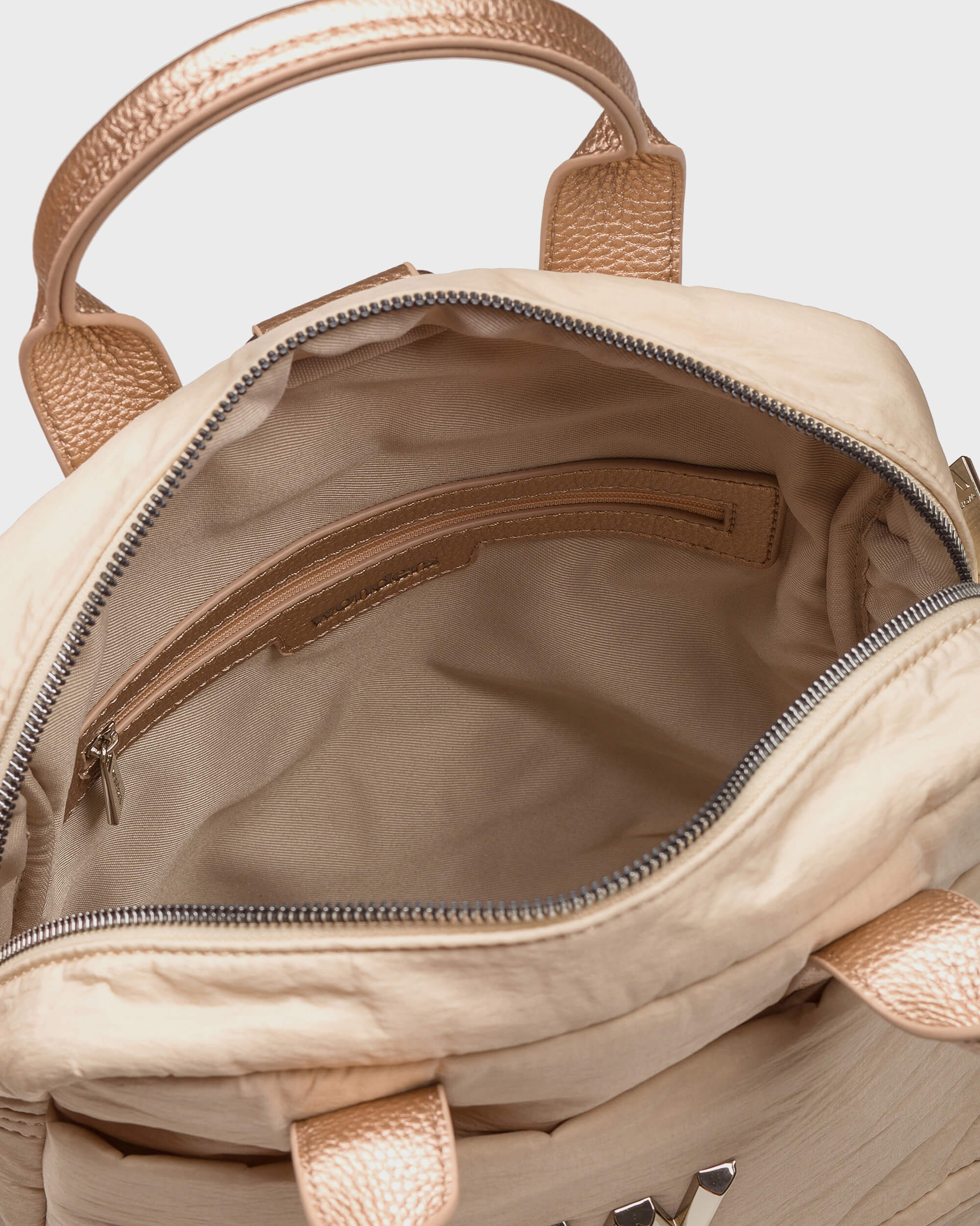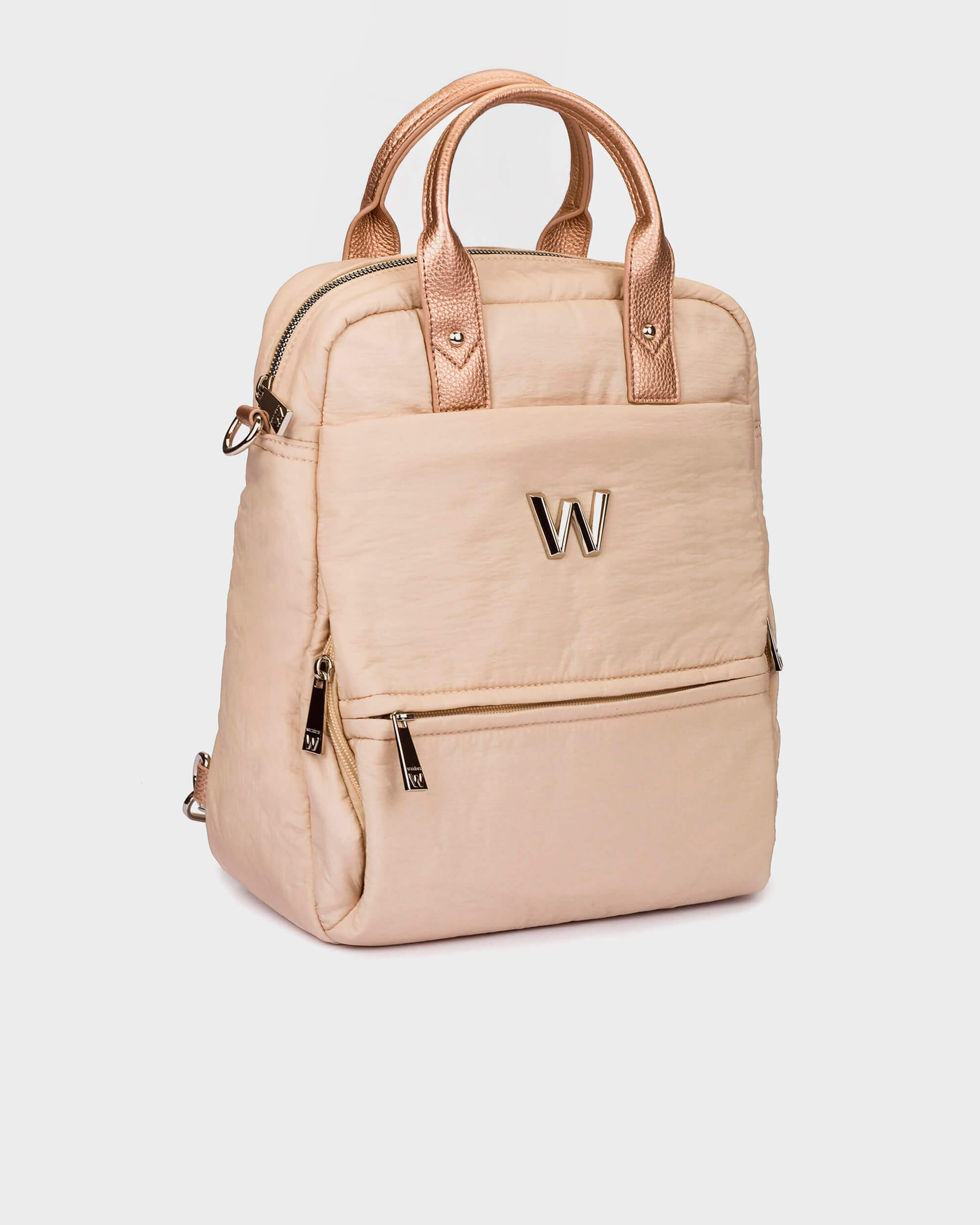 Stylowy i praktyczny plecak od hiszpańskiej marki Wonders. Kolor beżowy. Wykonany z najwyższej jakości materiału - nylonu. Ten średniej wielkości plecak ma wytłoczone litery marki. Plecak ma duża komorę oraz mniejszą kieszonkę na przodzie. Wewnątrz zapinana na zamek kiszonka na drobiazgi. Regulowane paski. Idealne uzupełnienie Twoich butów Wonders.